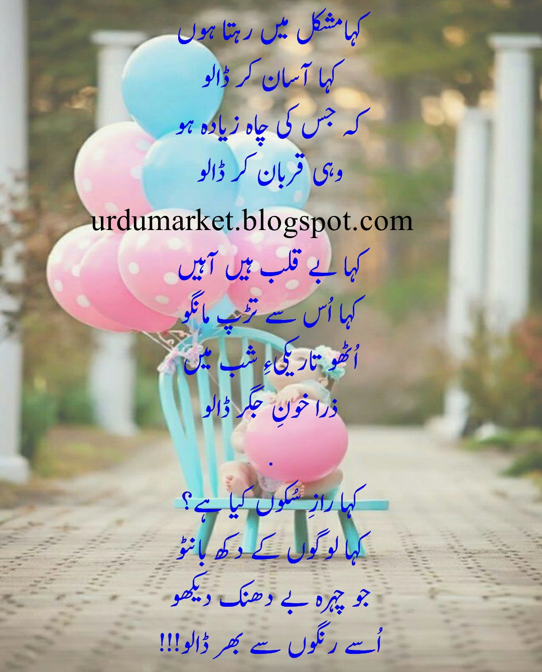 کہامشکل میں رہتا ہوں کہا آسان کر ڈالو کہ جس کی چاہ زیادہ ہو وہی قربان کر ڈالو . کہا بے قلب ہیں آہیں کہا اُس سے تڑپ مانگو اُٹھو تاریکیءِ شب میں ذرا خونِ جگر ڈالو . کہا رازِ سُکوں کیا ہے؟ کہا لوگوں کے دکھ بانٹو جو چہرہ بے دھنک دیکھو اُسے رنگوں سے بھر ڈالو!!!